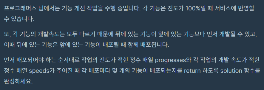 두 배열을 반복을 통해 값을 변환하고 앞에서부터 100이 달성 됐을 때 순차적으로 100이 달성한 값이 있는지 확인하고