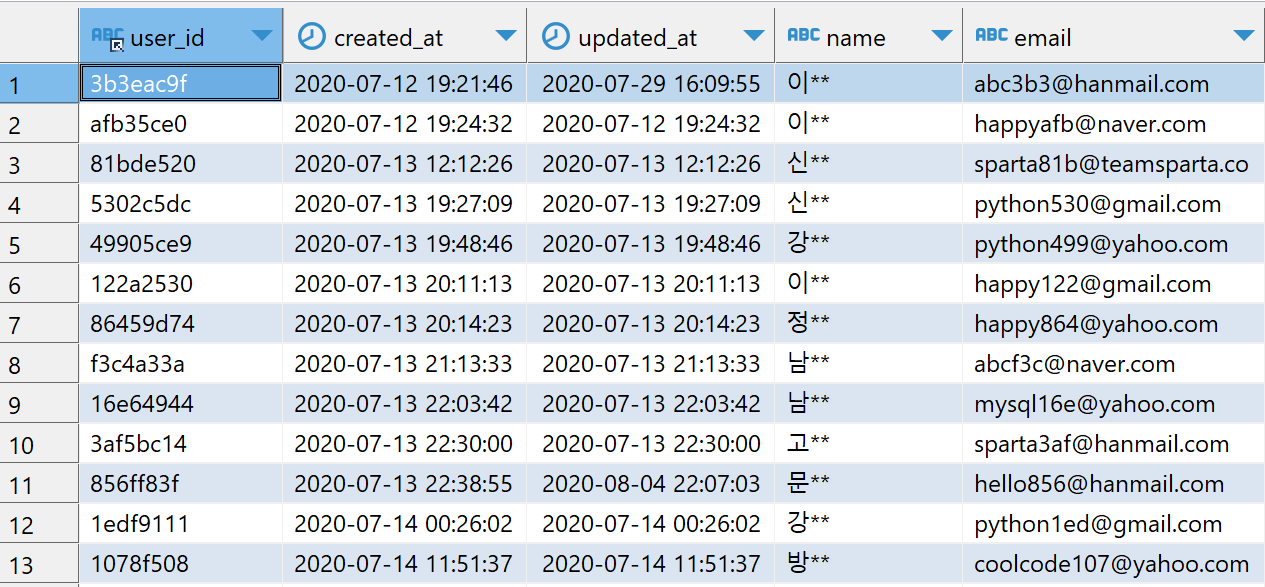 name: 익명화된 유저들의 이름(varchar255)