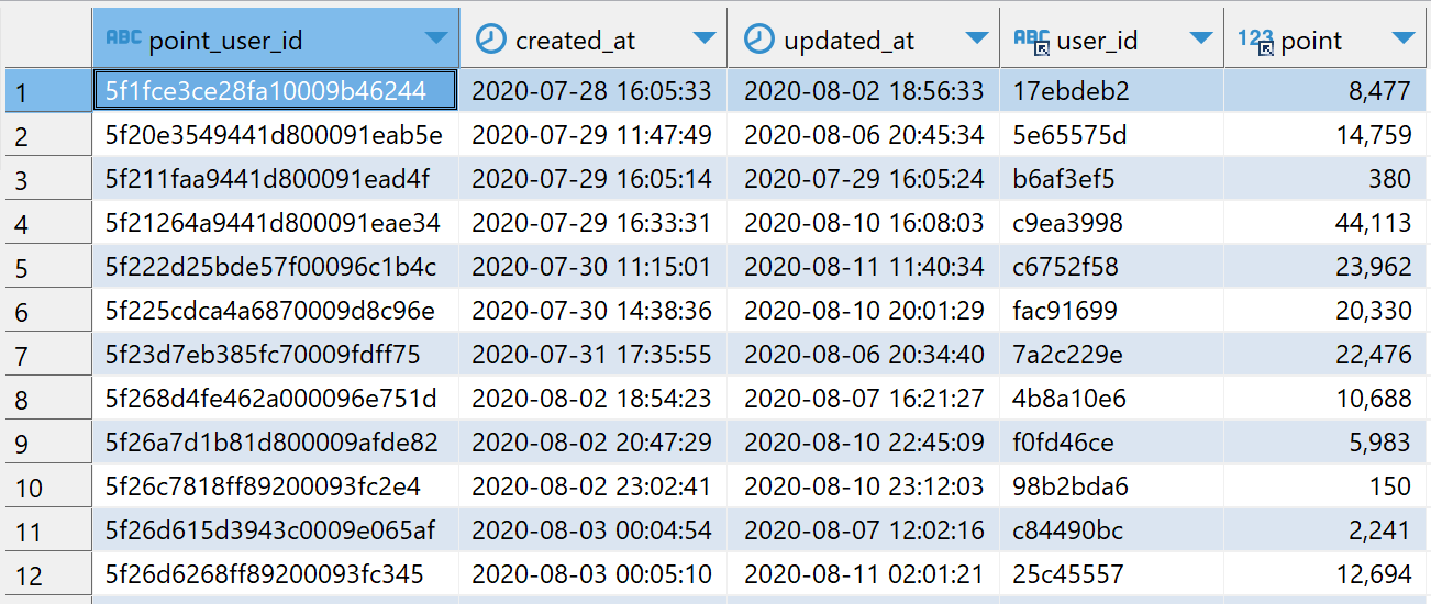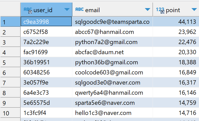 point_users 테이블은 스파르타코딩클럽 가입 유저들의 포인트에 대한 정보를 기록한 테이블입니다.
